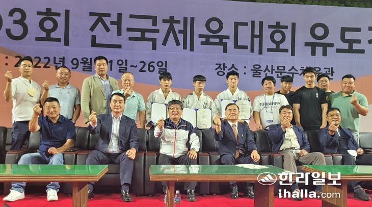 24일 울산문수체육관에서 열린 제103회 전국체육대회 남고부 유도대회에서 입상한 선수와 임원 및 지도자들이 기념촬영을 하고 있다. 제주유도회 제공