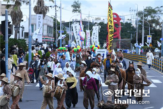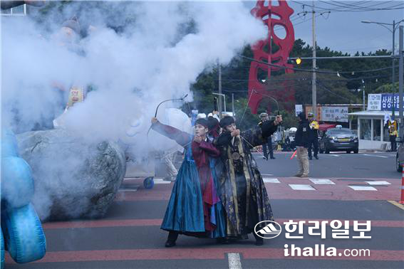 [한라일보] 제61회 탐라문화제 사흘째인 8일, '탐라문화제의 꽃'인 거리 퍼레이드가 축제 분위기를 한껏 고조시켰다. 다소 쌀쌀했지만 걱정했던 비가 다행히 오후에 그치며, 큰 문제없이 정성껏 준비한 퍼레이드는 성황리 마무리됐다.