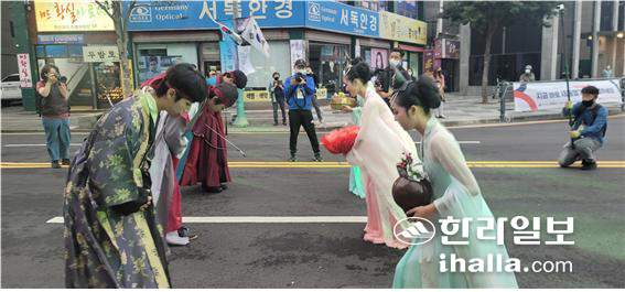 해병대 제9여단 군악대가 여는 퍼레이드 행렬에 삼성혈에서 합류한 고·양·부 삼신인은 중앙사거리에서 벽랑삼공주와 만난 혼례 퍼포먼스를 펼쳤고, 도민들은 뜨거운 환호로 호응했다.