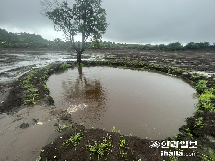 | 지난달 5일 대형 인공 숨골에서 동쪽으로 약 500여m 떨어진 곳에 있는 농경지 내 인공 숨골에 빗물이 가득찬 모습. |