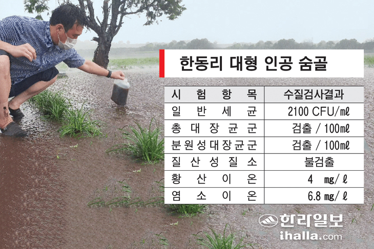 수질 분석 결과 일반세균의 경우 토지 중앙에 조성한 한동리 숨골과 인근 숨골에서는 각각 2100CFUmL, 2400CFU/mL가 검출됐다. 이는 '먹는물 수질기준 및 검사 등에 관한 규칙'에서 규정한 일반세균 기준치 100CFU/㎖보다 20배 이상 높은 수치다.