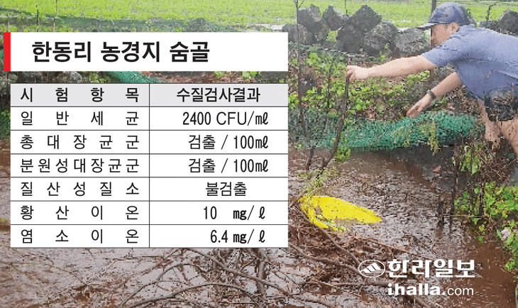취재팀은 이날 한동리 소재 두 곳의 숨골로 유입되는 지표수(빗물)의 시료를 채수해 제주도보건환경연구원에 일반세균, 총대장균군, 분원성대장균군, 질산성질소, 황산이온, 염소이온 등 5가지 항목에 대한 수질분석을 의뢰했다.