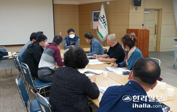 제주시 구좌읍 월정리 일대 토지주들이 12일 세계유산본부를 항의 방문해 관계자들과 간담회를 갖고 있다. 김도영기자