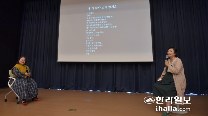 배우이자 작가인 발달장애인 정은혜 씨가 엄마 장차현실 씨와 함께 지난 15일 제주문학관에서 열린 '2022년도 하반기 도민 인권 아카데미'에서 강연하고 있다. 이상국기자