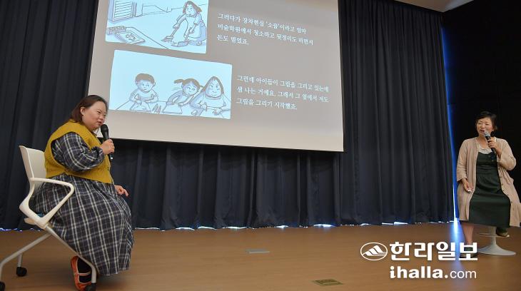 [한라일보] "안녕하세요. '니얼굴' 작가 정은혜입니다." 지난 15일 제주문학관에서 제주도 주최·한국지역혁신연구원 주관으로 열린 '2022년도 하반기 도민 인권 아카데미' 무대에 오른 은혜 씨가 인사를 건넸다. 만화가이자 엄마 장차현실 씨가 함께했다. 두 시간 가까이 이어진 강연에서 이 둘은 '제 꿈은 다 이뤄졌어요'라는 글로 시작한 발표 화면을 사이에 두고 '발달장애인의 삶과 예술'에 대한 이야기를 풀어냈다.