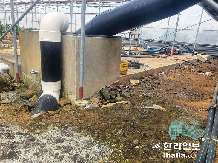 | 서귀포시 한경면 청수리 소재의 한 만감류 비닐하우스 내에는 과거 숨골을 정비해 물탱크 저장시설을 조성해 놓았다. |