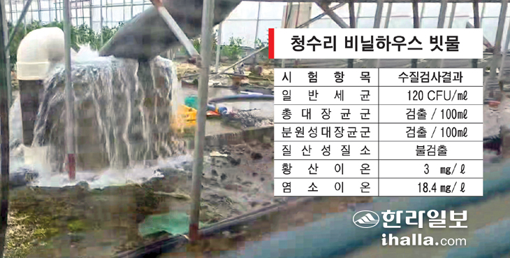 수질 분석 결과 비닐하우스내 숨골로 유입되는 빗물에서는 일반세균이 120CFU/mL나 검출됐다. 이는 '먹는물 수질기준 및 검사 등에 관한 규칙'에서 규정한 일반세균 기준치 100CFU/mL보다 다소 높은 수치다.