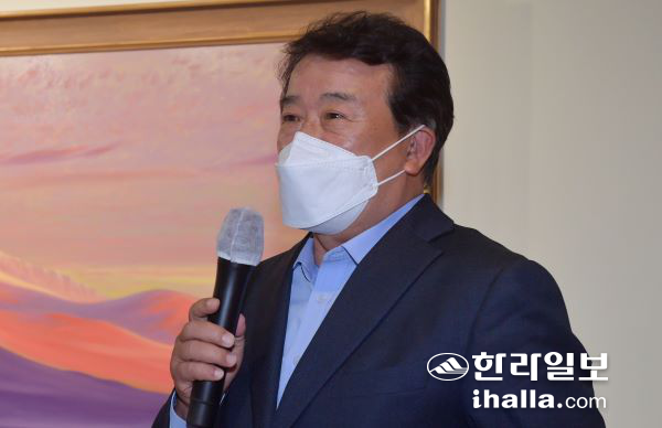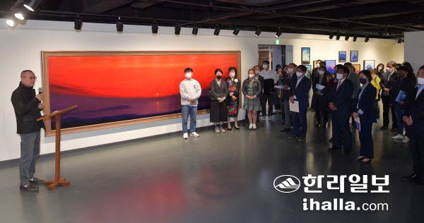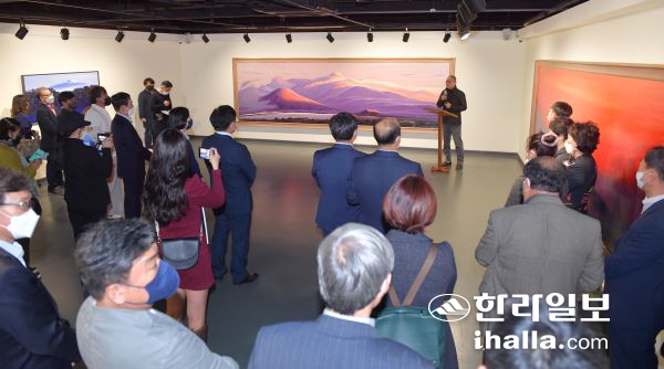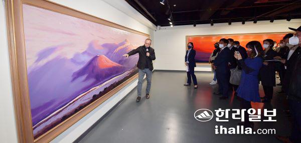 18일 한라일보 주최, 한라일보·이룸갤러리가 주관하는 채기선 작가 초대전 '한라산'의 막이 올랐다. 이날 한라일보 1층 갤러리ED에서 열린 전시 오프닝 행사에서 채기선 작가가 관람객들에게 작품을 설명하고 있다. 이상국기자