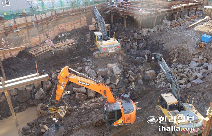지난 18일 현장을 확인해보니 대형 중장비들이 쉴 새 없이 움직이며 터파기 작업을 하고 있었고 대형 암반을 부수는 작업도 진행돼 큰 소음이 발생되고 있었다.