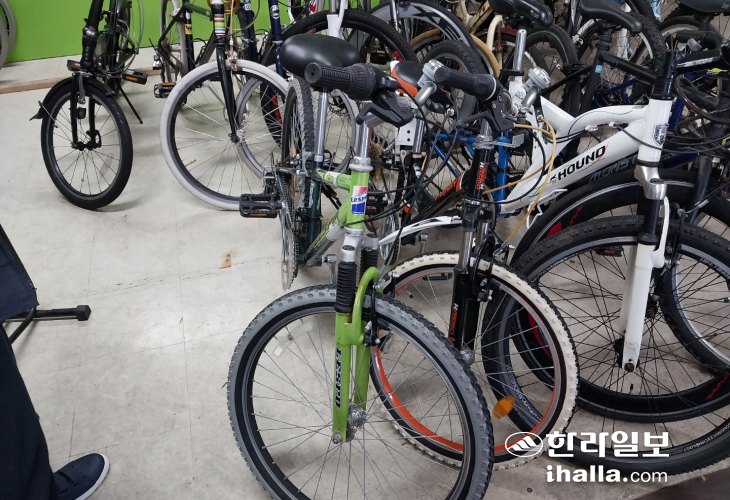 그는 "길거리 자전거 거치대에 세워 놓고 찾아가지 않는 자전거도 많다"고 했다. 그러면서 "월요일(지난 17일)에도 삼화지구에 한 아파트 단지에서 방치 자전거 70대를 수거해 왔다"며 "바로 다시 탈 수 있는 경우는 거의 없다. 녹이 많이 쓸어 있는 경우에는 고철로 폐기하고 다시 쓸 수 있는 경우엔 수리해 재활용한다"고 말했다.