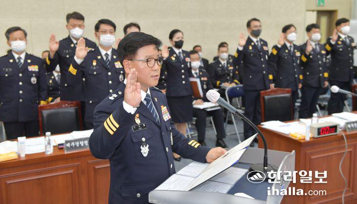 21일 제주도청에서 열린 국회 행정안전위원회 제주경찰청 국정감사에서 이상률 제주경찰청장과 경찰관들이 증인 선서를 하고 있다. 이상국기자