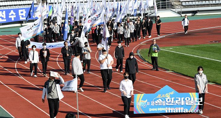 27일 서귀포시 강창학종합경기장에서 열린 제56회 도민체육대회 모의개회식에서 기수단이 입장하고 있다. 강희만 기자