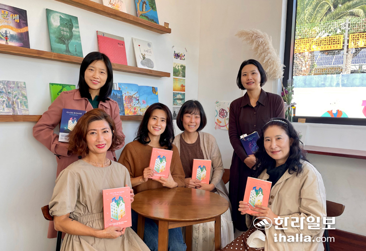 | 초등학교 앞 작은 카페에서 매주 목요일 오전에 만나는 서호독서모임 회원들이 소설 '미드나잇 라이브러리'를 들고 포즈를 취했다. 서귀포시민의책읽기위원회 |