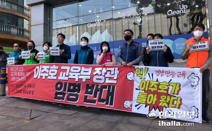 [한라일보] 전국교직원노동조합 제주지부와 민주노총 제주본부 등 제주지역 11개 단체는 28일 국민의힘 제주도당 앞에서 기자회견을 열고 "MB 교육의 상징이자 공교육 황폐화의 주범인 이주호 교육부 장관 임명을 반대한다"고 말했다.