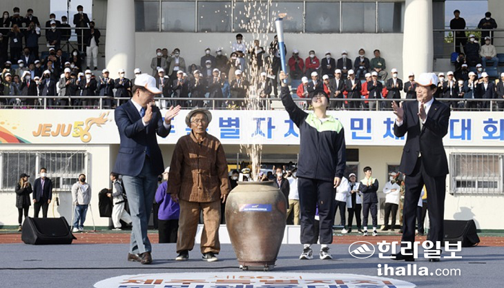 | 28일 오후 서귀포시 강창학경기장에서 열린 제56회 제주특별자치도민체육대회 개회식에서 성화 최종주자인 오예진이 오영훈 지사와 부평국 도체육회장 등과 항아리모형의 성화대에 점화화고 있다. 이상국 기자 |