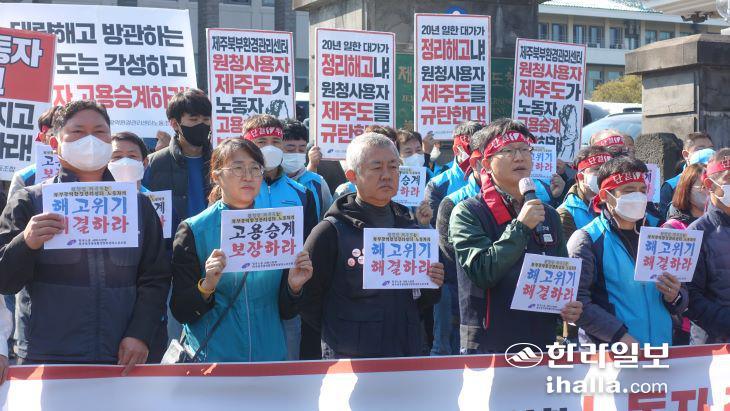 환경관리센터 노동자들은 "제주도는 공공부문의 외주화 금지, 공공부문 비정규직 제로화에 공감했고 환경관리센터의 공익성을 인정했기 때문에 노동자의 고용승계를 약속했다"며 "하지만 제주도는 당시 합의가 체결되지 않았다는 이유만으로 지금은 고용 문제 해결에 모르쇠로 일관하고 있다"고 비판했다.