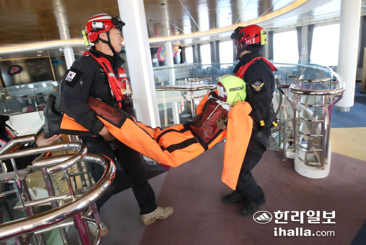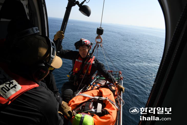 먼저 제주해경 흰수리 헬기가 사고 선박에 도착해 여객선 내부에 대한 수색을 실시하고 의식을 잃은 부상자를 구조해 헬기로 이송했다.