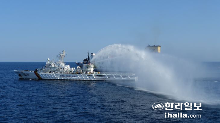 | 해경 함정에서 소화포를 이용해 여객선 화재를 진압하고 있다. |