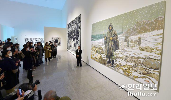지난 2017년 첫선을 보인 후 5년 만에 다시 찾아온 '제3회 제주비엔날레' 개막식이 15일 제주도립미술관 로비에서 진행됐다. 이날 박남희 예술감독이 참석 내빈들과 함께 도립미술관 전시를 둘러보며 작품을 소개하고 있다. '움직이는 달, 다가서는 땅'을 주제로 내건 올해 제주비엔날레에는 16개국 55명(팀)의 작가가 참여한 가운데 내년 2월 12일까지 89일간 165점의 작품을 선보인다. 이상국기자