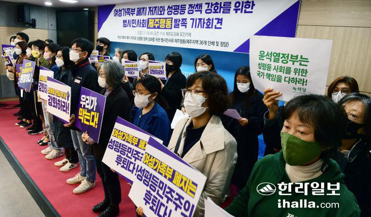 여성가족부 폐지 저지와 성평등 정책 강화를 위한 범시민사회 제주행동(이하 제주행동)은 16일 제주도의회 도민카페에서 출범 기자회견을 열고 윤석열 정부와 국민의힘의 '여성가족부 폐지' 정부조직법 개정안을 끝까지 막아내고 성평등 정책 강화를 통한 성평등 민주주의를 위해 활동하겠다고 밝혔다.