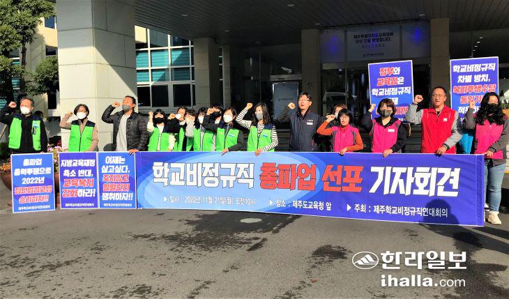 [한라일보] 전국교육공무직본부 제주지부와 전국학교비정규직노조 제주지부 등 전국학교비정규직연대회의(이하 연대회의)는 21일 제주도교육청 앞에서 기자회견을 열고 "학교 비정규직 차별을 방치하는 정부와 교육감을 규탄한다"며 "오는 25일 단일 임금 체계 도입과 복리후생비 동일기준 적용 등을 위한 총파업에 돌입한다"고 밝혔다.