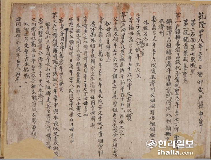 [한라일보]18세기 후반~20세기 전반에 걸쳐 매 3년마다 마을 단위로 호구(戶口) 상태를 파악한 기록물인 '제주 호적중초'는 타 지역에 비해 도내 마을에서 다량 확인되어지고 있다. 이는 제주도가 일종의 '호적자료의 보고'임을 증빙하는 셈이다.