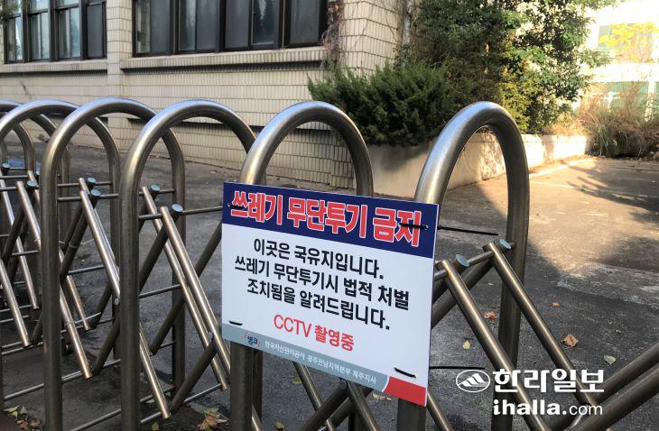 제주시 건입동 옛 제주출입국관리소에 쓰레기 무단투기 금지 안내판이 설치돼 있다. 김도영기자