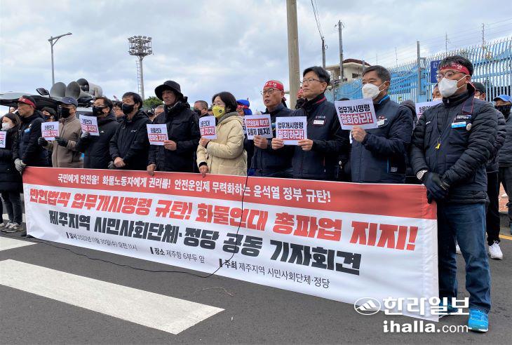 [한라일보] 제주지역 29개 시민사회단체와 정당 등이 화물연대 파업과 관련한 정부의 업무개시 명령을 규탄하며 파업을 지지하고 나섰다.