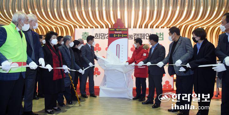 30일 제주도청 로비에서 진행된 제주사랑의열매 \'희망2023 나눔캠페인\' 출범식에서 참석자들이 사랑의 온도탑 제막식을 진행하고 있다. 이상국기자