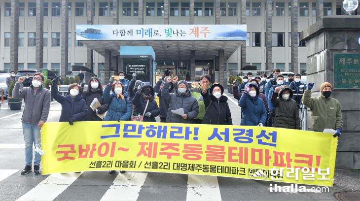 선흘2리 대명제주동물테마파크 반대대책위원회도 약 1시간 뒤 제주도청 앞에서 기자회견을 열고 "제주도 개발사업심의위원회는 조례가 규정한 기준 중 그 어느 것 하나도 만족시키지 못하는 제주동물테마파크 사업의 기간 연장을 즉각 불허하라"고 말했다.