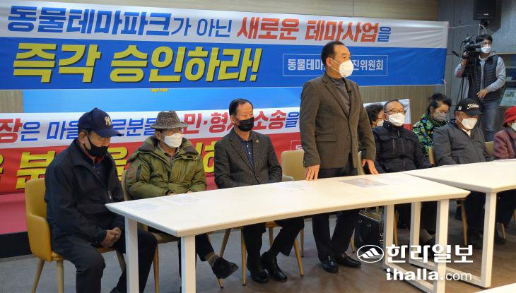 제주동물테마파크 선흘2리 추진위원회가 1일 제주도의회 도민카페에서 제주도 개발심의위원회의 사업 기간 연장을 촉구하는 기자회견을 열고 있다. 김도영기자