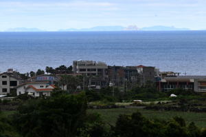 길옆에는 돌담을 의지해 한가득 피어있는 산국이 노란 얼굴로 반긴다. 소록산 남쪽 기슭의 소하천으로 접어드니 아직도 하얀 꽃을 뽐내고 있는 궁궁이와 마주친다. 소하천을 넘어 삼나무 가득한 숲길과 솔밭길을 지나면 임도를 만나고, 임도는 소록산 정상을 향해 이어진다. 소록산(족은사슴이)은 높이가 102m로 남북으로 길게 누워있는 모습이다. 북동쪽으로 벌어진 굼부리가 있는데 남서향으로도 두 가닥의 등성이 사이로 굼부리로 보이는 지형이 있다. 이를 쌍둥이 화산체로 표현한 책도 있다. 정상으로 이어지는 길에는 석송이 햇빛을 받아 반짝인다. 숲이 주위 풍광을 막고 있지만 키 작은 나무 사이로 한라산 방향의 경치를 볼 수 있다.