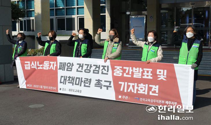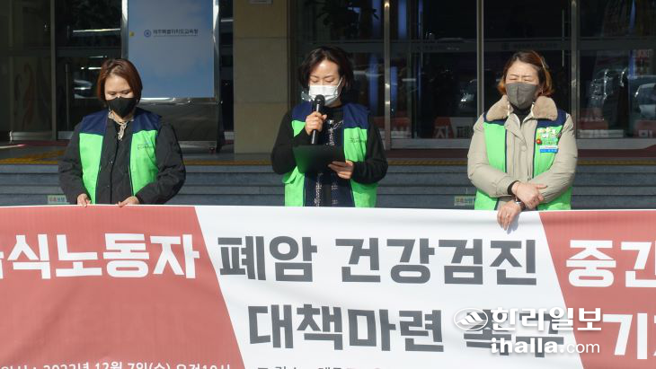 [한라일보] 민주노총 공공운수노조 전국교육공무직본부 제주지부(이하 교육공무직 제주지부)는 7일 제주도교육청 앞에서 기자회견을 열고 "학교 급식실 노동자 폐암검진 중간 조사 결과 187명이 폐암을 예고하고 있다"며 "교육당국은 산재 종합대책을 당장 마련하라"고 촉구했다.