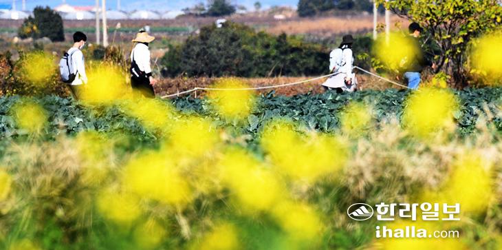유채꽃길 따라10일 서귀포시 대정읍 하모리의 농경지를 지나는 올레길에서 올레꾼들이 유채꽃을 배경으로 걸어가고 있다. 강희만기자