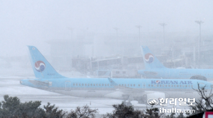 | 18일 제주전역에 폭설이 내린 가운데 제주국제공항에도 많은 눈이 내리고 있다. 강희만기자 |