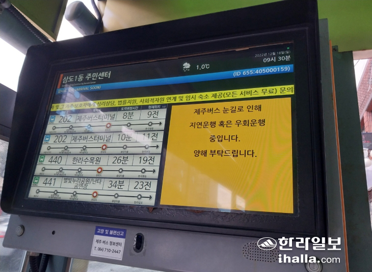 | 18일 제주시 삼도1동주민센터 버스정류소에 설치된 안내 화면에 버스가 '눈길로 인해 지연운행 혹은 우회운행 중'이라는 안내가 나오고 있다. |