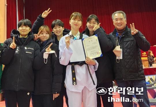 2022년도 전국 남녀우수선수선발대회에서 2위를 차지한 박가형(가운데 흰색 도복)과 윤희섭 제주도청 태권도 감독(맨오른쪽).