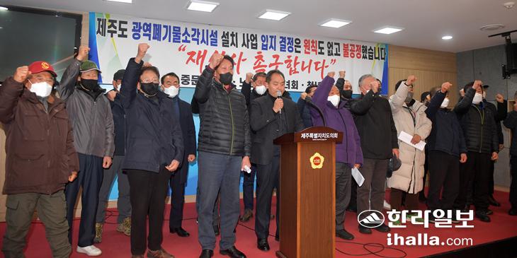 중문마을회는 19일 제주도의회 도민카페에서 기자회견을 열어 "불공정한 광역폐기물소각시설 입지 결정을 백지화하라"고 주장했다.