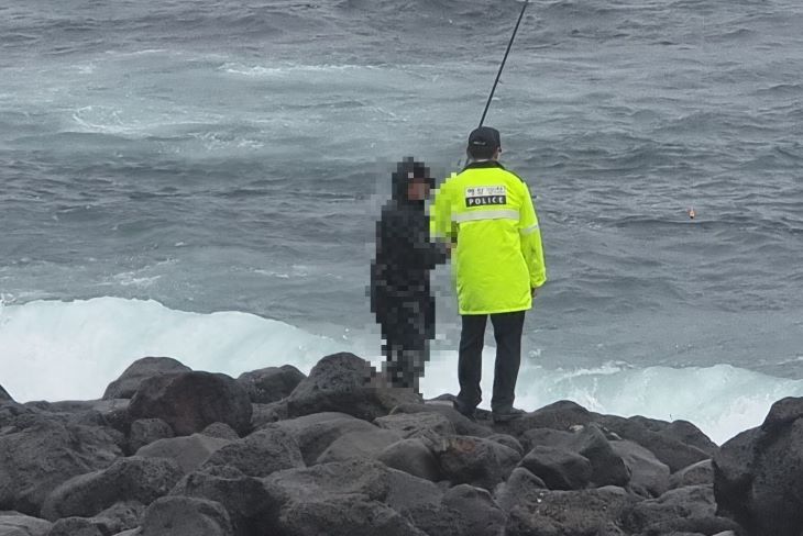 | 서귀포해경 대원이 연안 안전사고 주의보 발령에 따라 갯바위 낚시객에 대한 순찰 활동을 실시하고 있다. 서귀포해양경찰서 제공 |