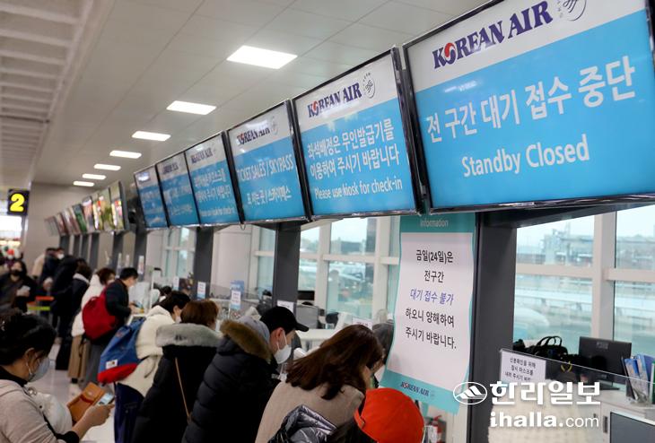 앞서 연이은 폭설과 강풍으로 제주공항에 기상 악화가 이어져 지난 22일에는 279편, 23일에는 사전 결항편(296편)을 포함해 477편이 결항됐다.