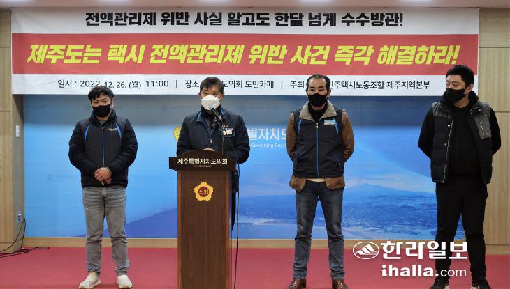 전국민주택시노동조합 제주지역본부 관계자들이 26일 제주도의회에서 기자회견을 열고 있다. 김도영기자