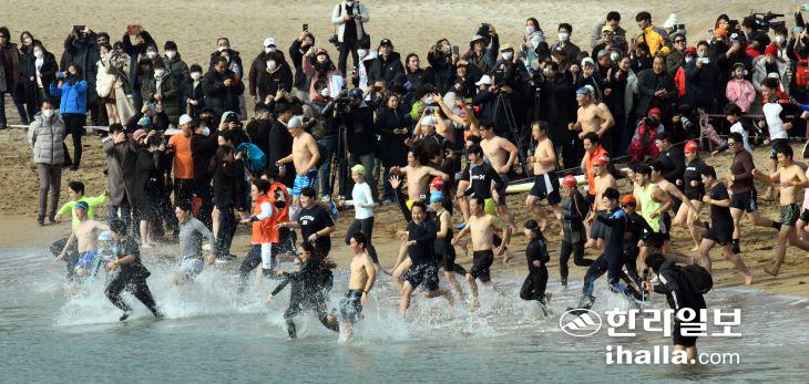1일 서귀포시 중문색달해수욕장에서 열린 제24회 서귀포 겨울바다 국제펭귄수영대회 참가자들이 바다로 뛰어들고 있다. 강희만기자