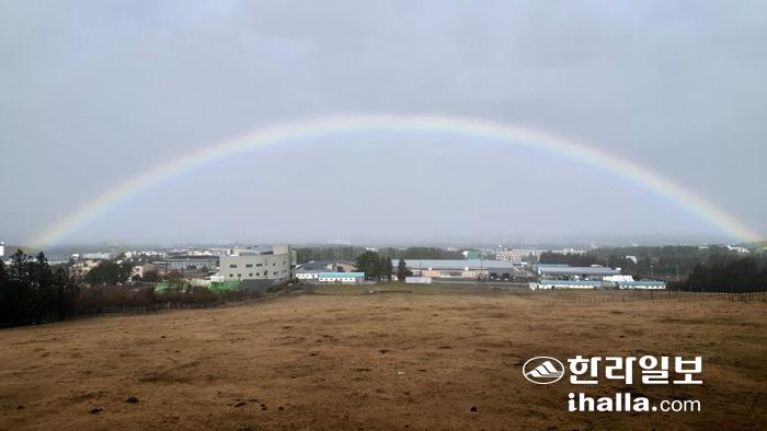 13일 낮 비가 잦아들면서 제주시 아라동지역에 떠오른 무지개. 강희만기자