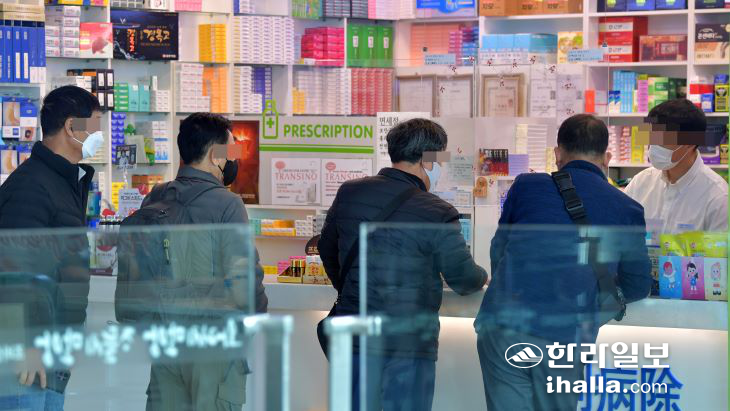 | 30일 제주공항 내 약국을 방문한 이용객들이 마스크를 착용한 채 약을 구입하고 있다. 이상국기자 |