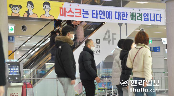 실내 마스크 착용의무 해제 첫날인 30일 제주국제공항에는 마스크 착용을 안내하는 현수막이 게시돼 있다. 이상국기자