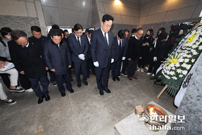 | 국민의힘 정진석 비상대책위원장이 13일 오전 제주시 봉개동 4·3평화공원 위패봉안실을 찾아 참배하고 있다. 연합뉴스 |