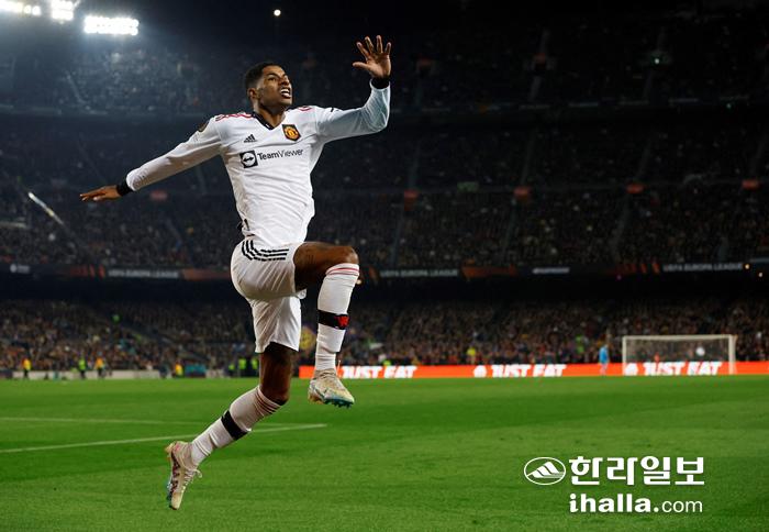 17일 스페인 바르셀로나의 캄노우에서 열린 바르셀로나와의 022-2023시즌 UEL 플레이오프(PO) 1차전에서 첫 골을 넣은 맨유 래시퍼드. 연합뉴스