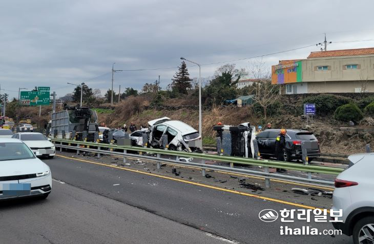 [한라일보] 제주 평화로에서 차량 9대가 충돌하는 교통사고가 발생해 부상자 10여 명이 병원으로 이송됐다.