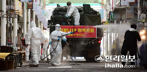 코로나19 발생 초기 대대적으로 이뤄졌던 방역작업. 한라일보DB