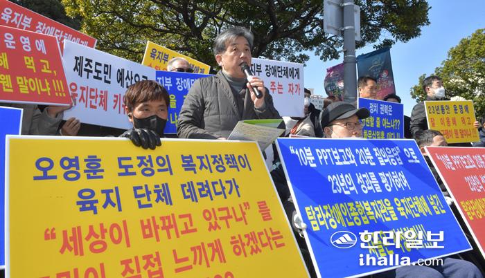 21일 제주도청 앞에서 제주자치도장애인총연합회가 기자회견을 열고 탐라장애인종합복지관 관리주체 변경을 비판하고 있다. 이상국기자